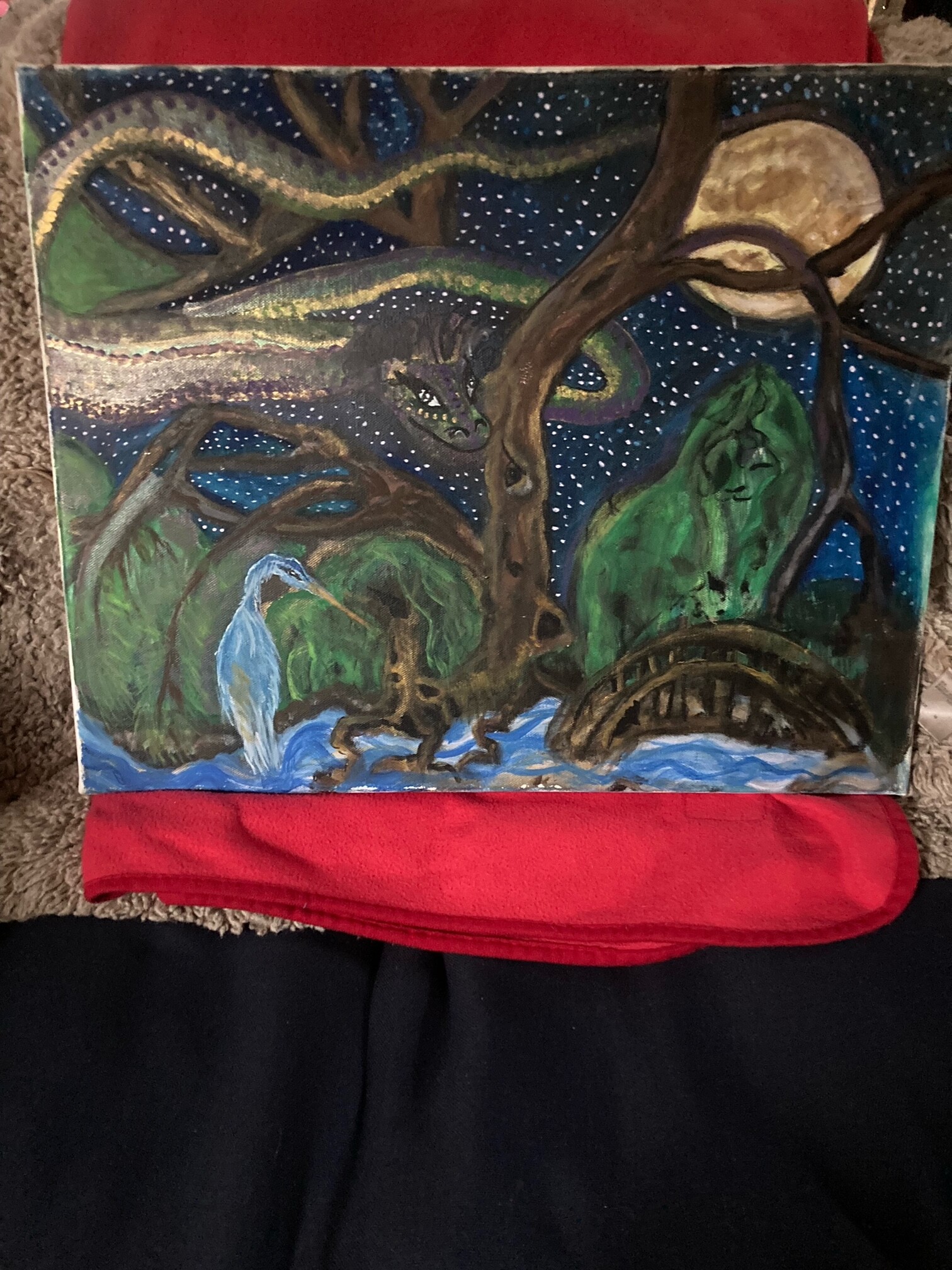 It depicts many observances when looking closely. One of which I noticed as I worked on it more, the likeness to spine and where I was injured-thoracic T7-10 seemed to be sprouting blood (in the painting and in my body)