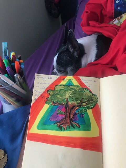 My beloved dog Persaeus and a rainbow tree in my ‘Book of shadows’ 2019