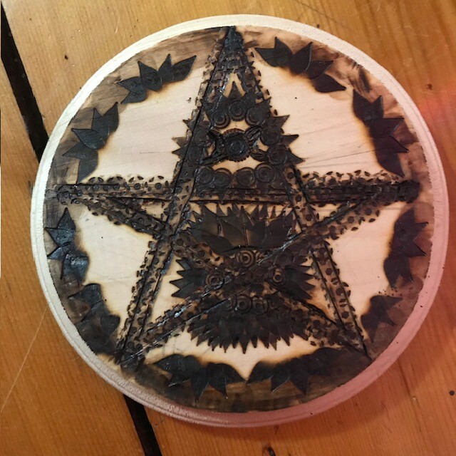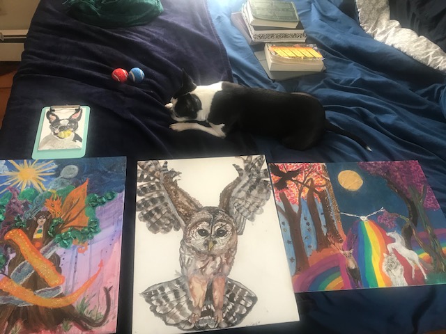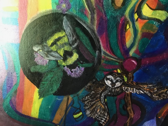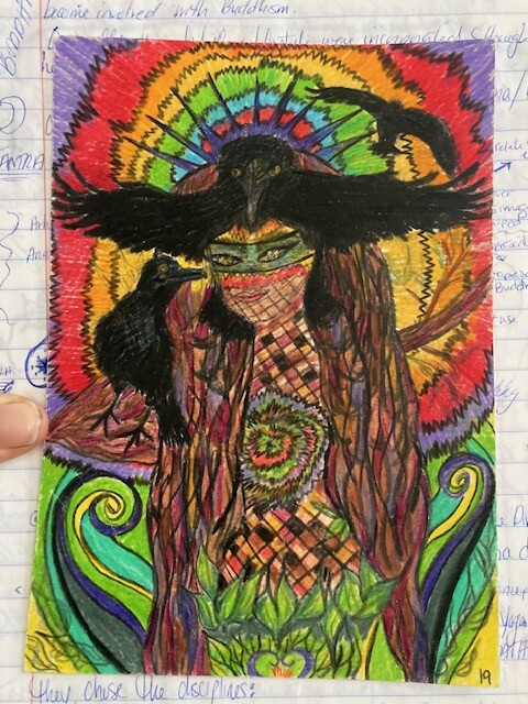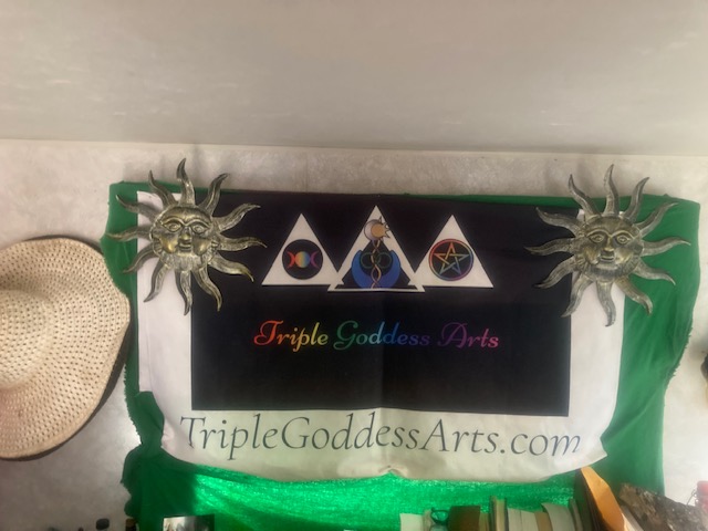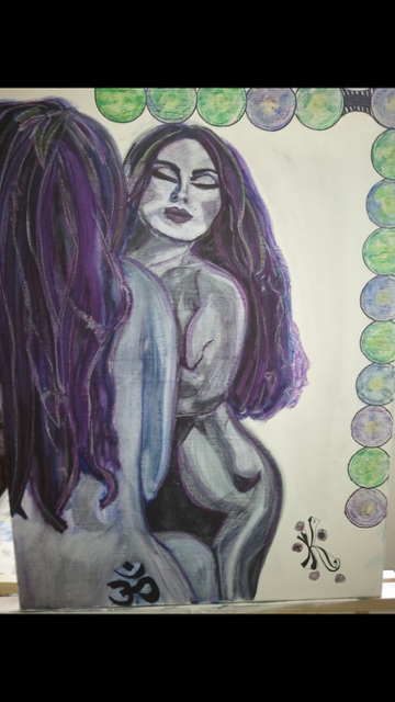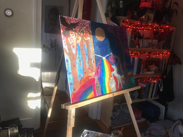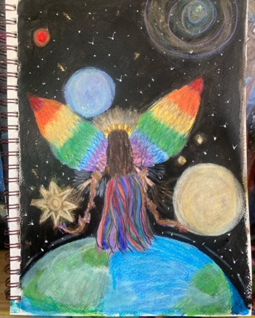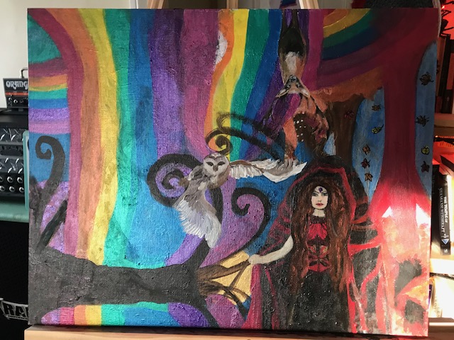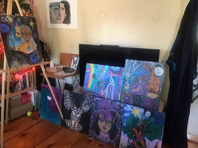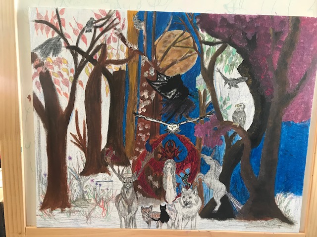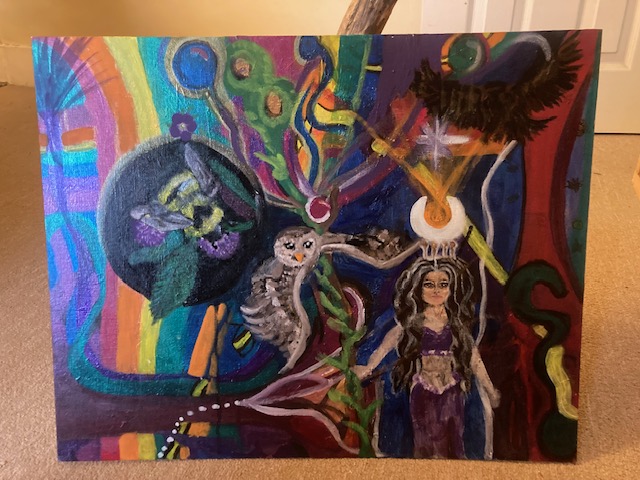 I also wanted to depict what occurs with my process of art, pulling in elements of my life, spirituality and Magickal practice to create. They often times morph into multiple expressions in that time: sometimes over years of painting. They are of my spiritual experiences so not always the finest art, as opposed to painting or sketching from a photo-but as an untrained artist, they are my expression. That art/design degree I dreamed of, will be a dream, as a woman in the lower ‘caste’ of American society.