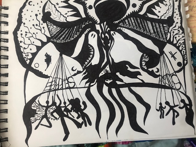 This was supposed to be a rough draft (someday turned into a painting) depicting the MANY colors that make up the women of the USA. Many races, religions, & cultures, that are all diverse & beautiful and deserve the same respect, under the lady liberty’s protection. Breaking the chains of the sacred sisters/daughters as the ‘All’ mother figure, freeing us from this earth that insists on being hell. Rise up. The light guides. Flame ignite and burn bright.