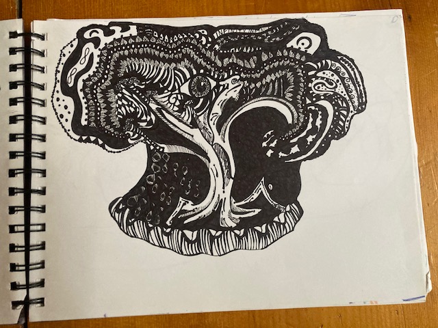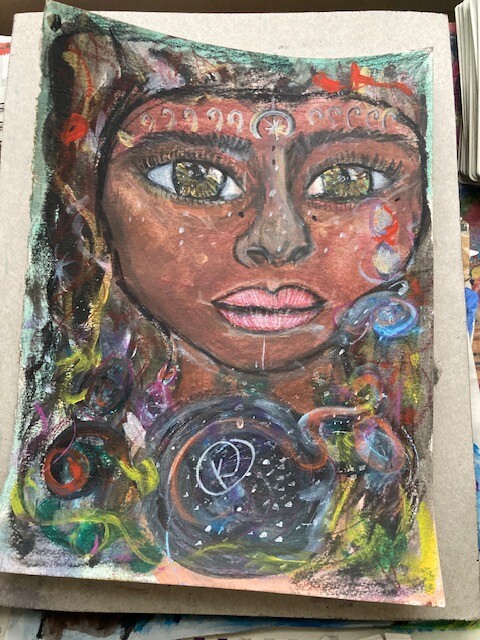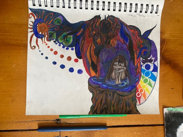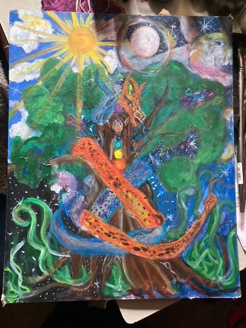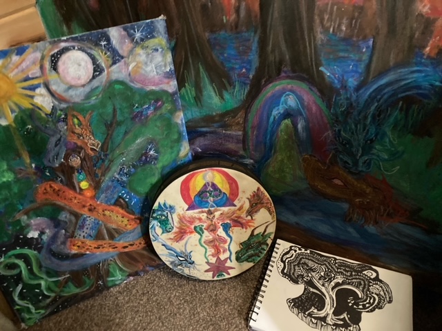 Alchemical dragons, shaman initiation drum 2020 & Angel of death communication mural (in progress)