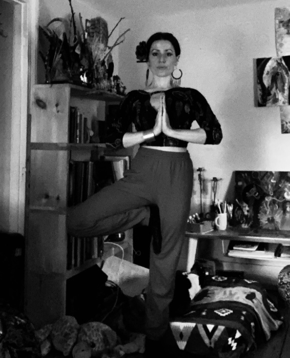 Beginners-place one foot upon the opposite ankle, slightly above the earth-hold posture, leg of the raised foot should make a ‘ bow’ shape. If this is easy, gradually raise up to your knee. Hold posture with hands in prayer pose. Lightly gazing in front of you. Do not press against the knee with the foot.