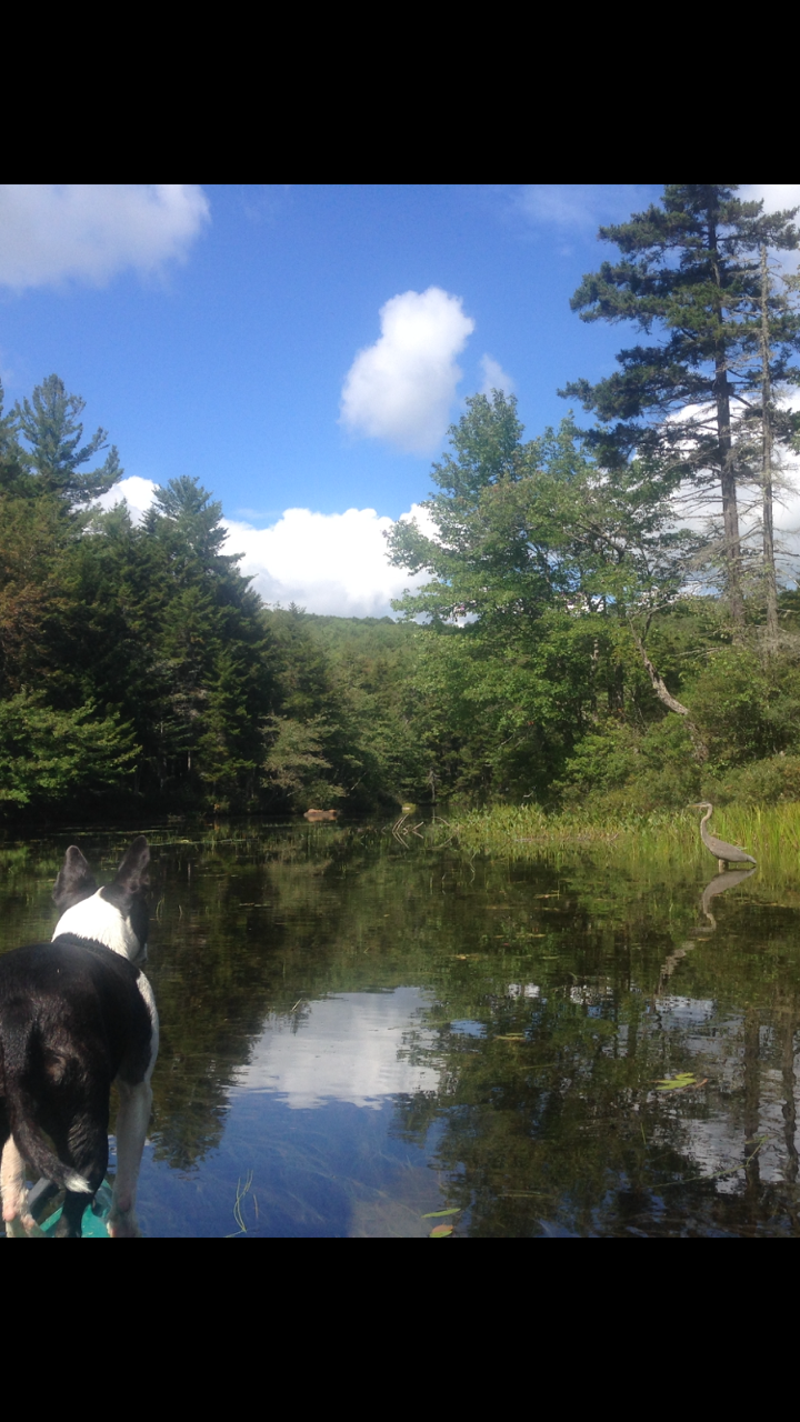 My dog on my kayak and Blue Heron